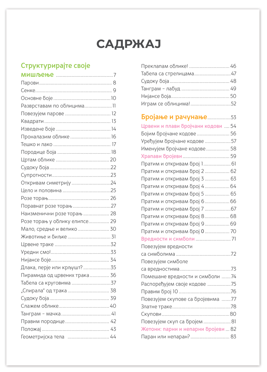 U prvom delu, kroz aktivnosti razvrstavanja i vizuelnog razdvajanja oblika, boja i veličina, dete će struktuirati svoje mišljenje. Od deteta će se tražiti da manipuliše, upoređuje, povezuje oblike i objekte, da preklapa (pomoću tangrama, sudoku oblika, karata za grupisanje).