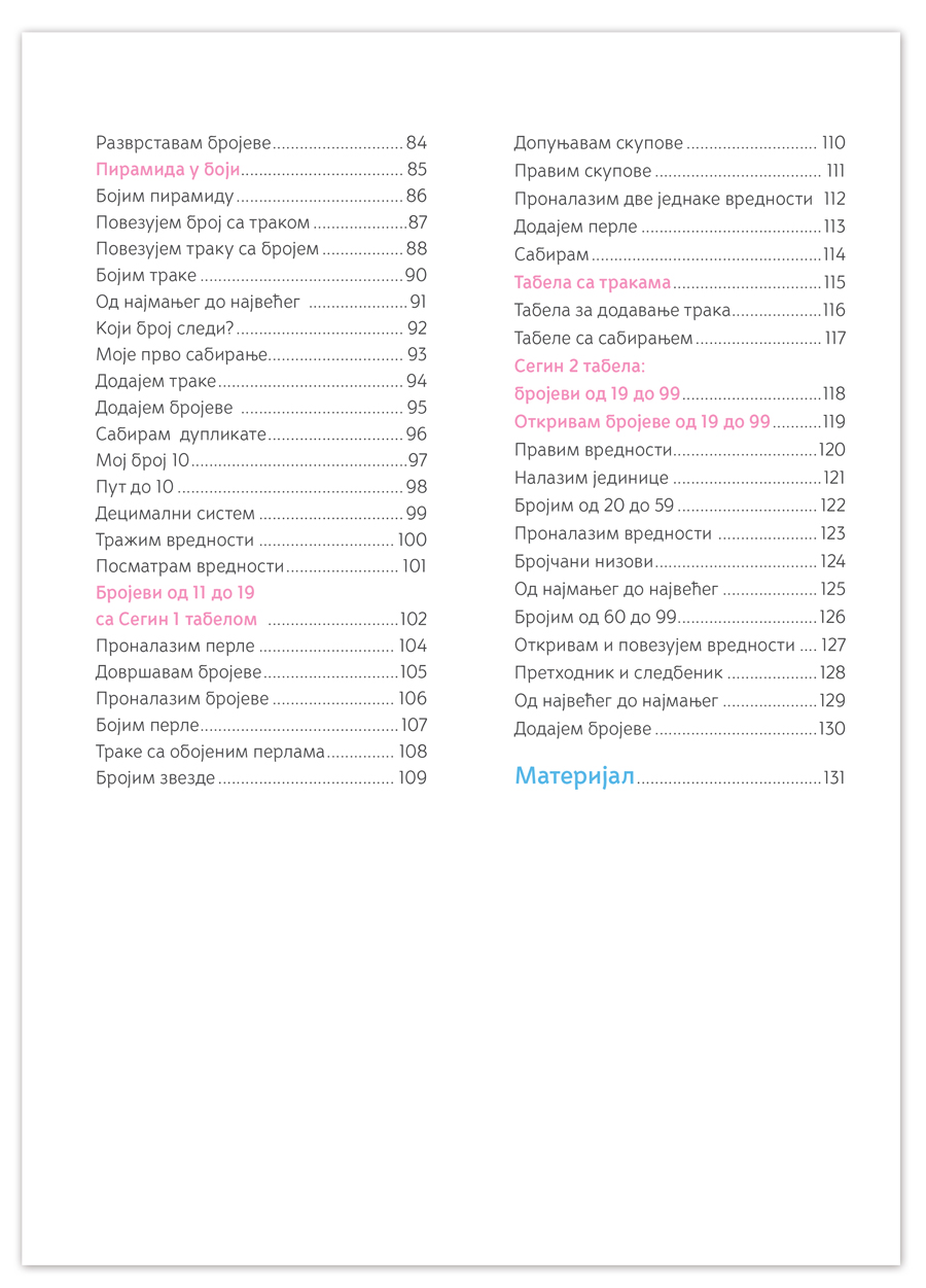 Kako bi realizovalo brojne aktivnosti na putu učenja geometrije, otkrivanja brojeva i računanja, dete će koristiti Montesori materijal koji je priložen na kraju radne sveske.