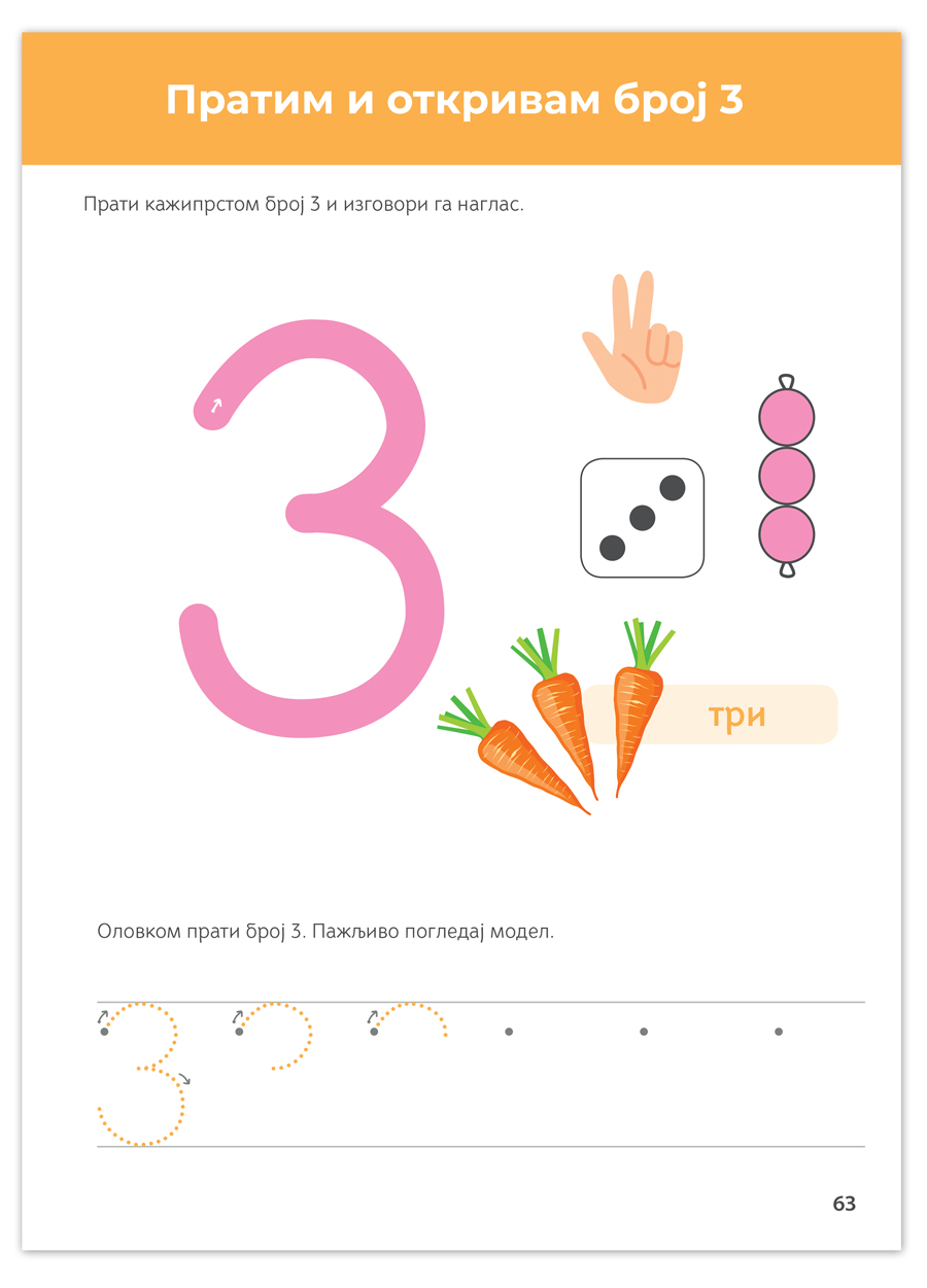 U drugom delu, dete će učiti brojanje i računanje, uvek prateći lekciju u tri koraka.