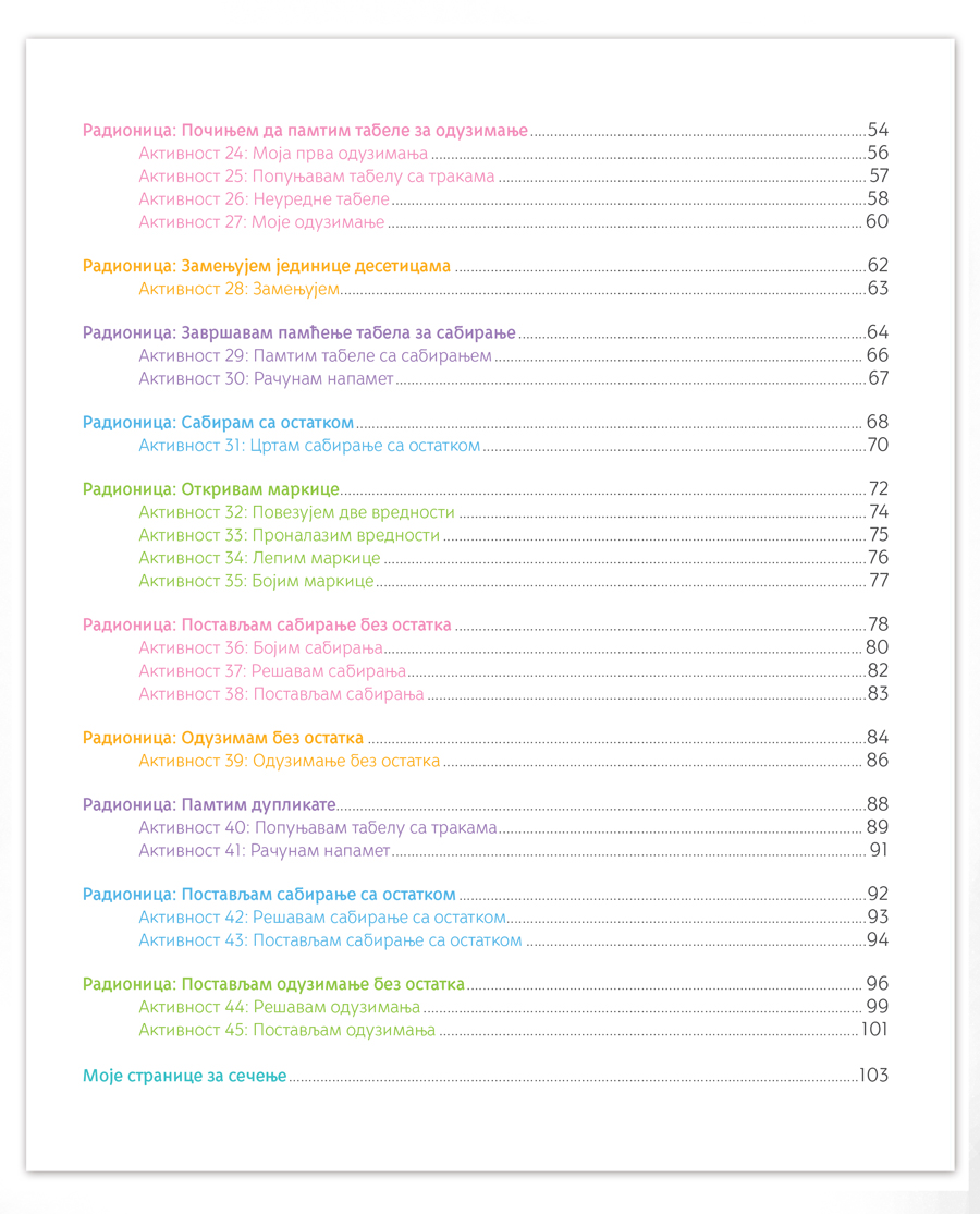 * stranice sa radionicama, koje će omogućiti detetu da se upozna sa brojevima, da postepeno shvati računanje (sabiranje sa ostatkom i bez ostatka, oduzimanje), kao i decimalni sistem.