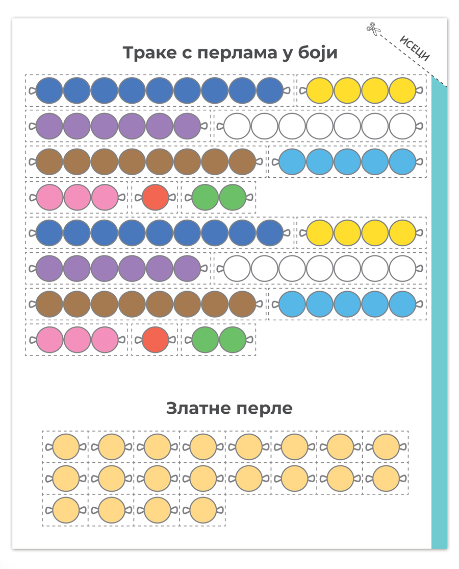 - trake sa zlatnim perlama za brojanje, poređenje, sabiranje i oduzimanje;