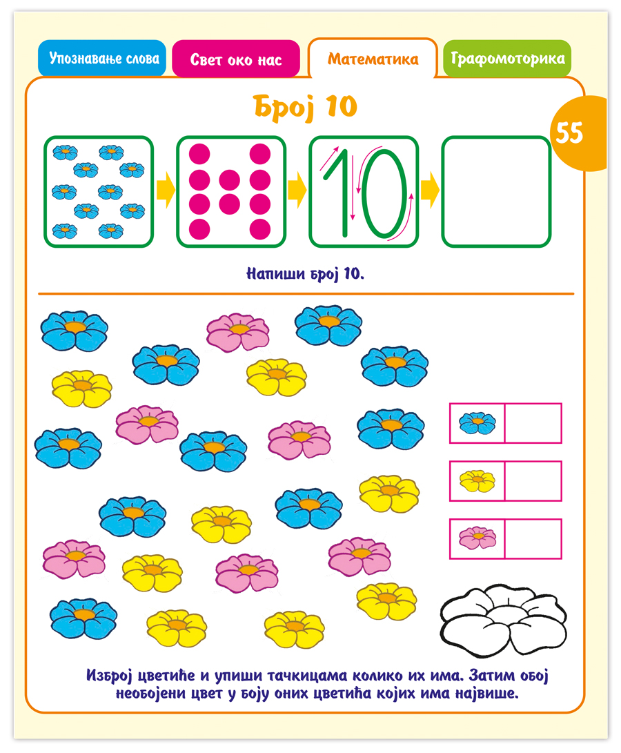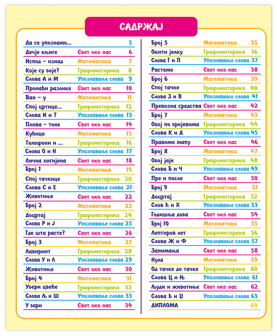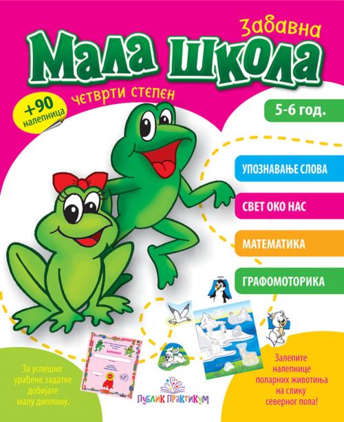 Radna sveska, zabavna MALA ŠKOLA, namenjena je deci uzrasta od 5-6 godina i u velikoj meri priprema decu mlađeg predškolskog uzrasta da na kreativan način stiču prva znanja iz matematike, živom i neživom svetu, o godišnjim dobima, jednom rečju o svemu onome što ih okružuje ali u mnogo većoj meri doprinosi prvim saznanjima o snalaženju i organizaciji u prostoru, veličinama predmeta i rasporedu u prostoru, sličnostima i razlikama predmeta, oblicima i pojmovima, prevoznim sredstvima, predmetima za ličnu higijenu, članovima porodice, itd. Kroz maštovite i kreativne zadatake u kojima je predviđeno da deca docrtavaju oblike iscrtane tačkicama, da raspoznaju i boje predmete, rešavaju prilično komplikovane matematičke i logičke zadatke, razlikuju domaće od šumskih ili morskih životinja, raspoznaju njihova staništa, čime se one hrane, da stiču prva saznanja o tome gde se uzgajaju koje vrste biljaka, o zanimanjima ljudi, itd. Akcenat je stavljen na samostalno prepoznavanje i pisanje slova, raspoznavanje reči koja počinju zadatim slovima. Svaka knjiga sadrži kao dodatak malu diplomu i nalepnice.