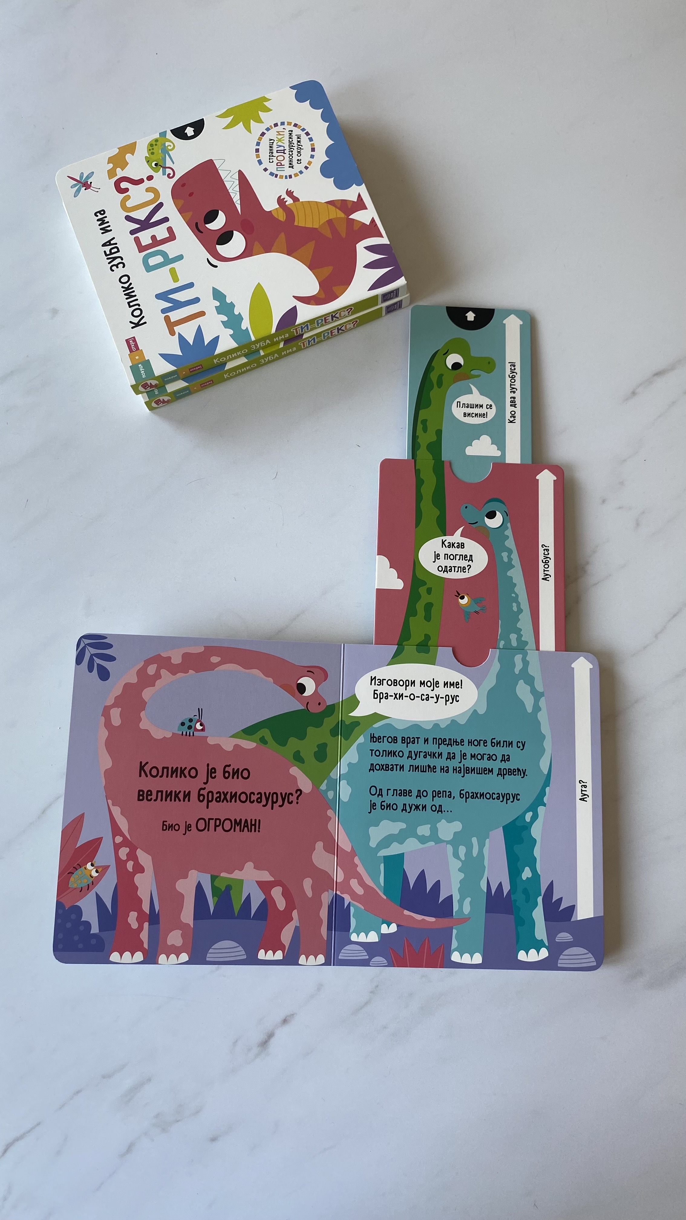 Saznaj zanimljive činjenice o dinosaurusima na duplim stranama koje se izvlače.
