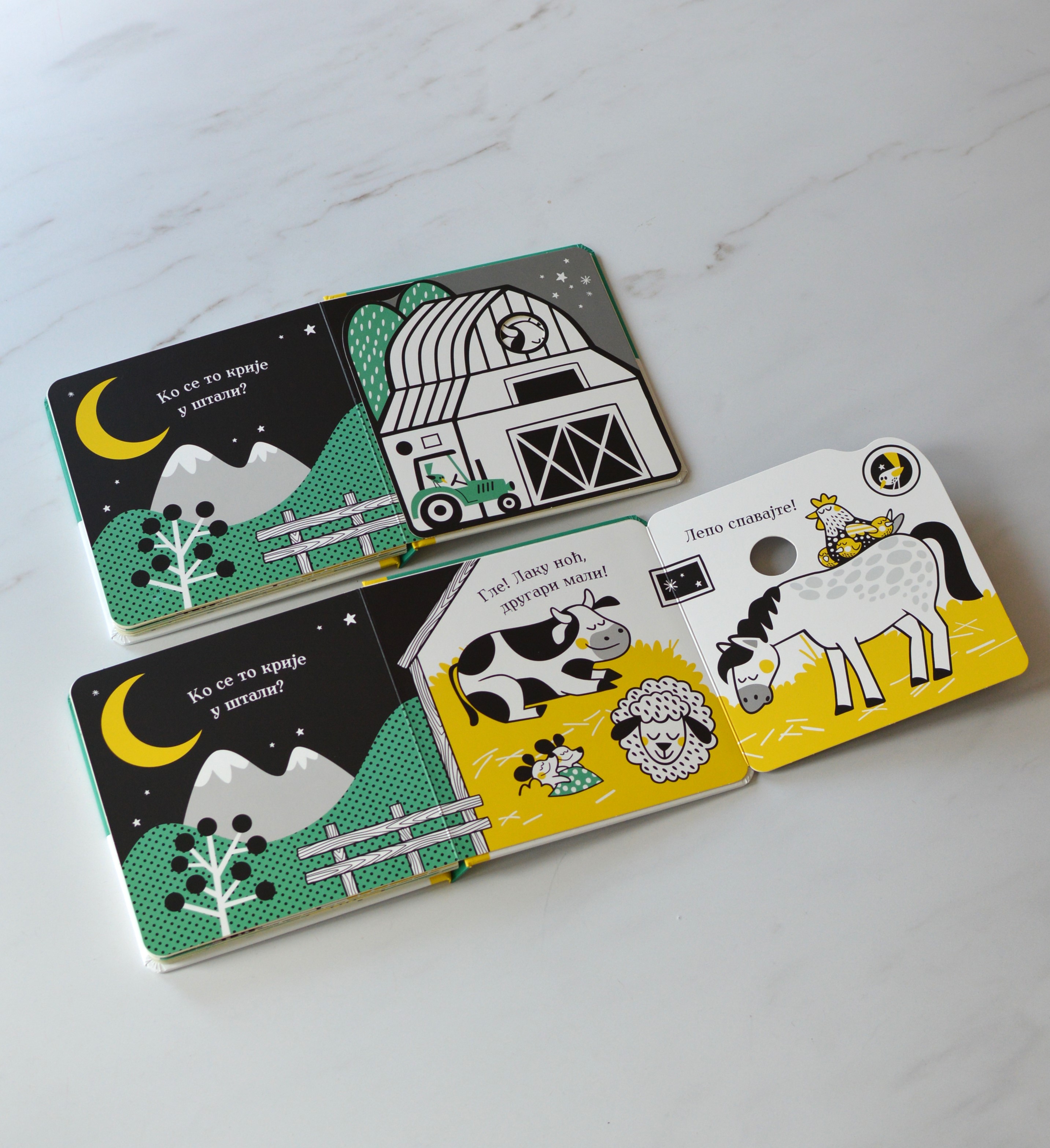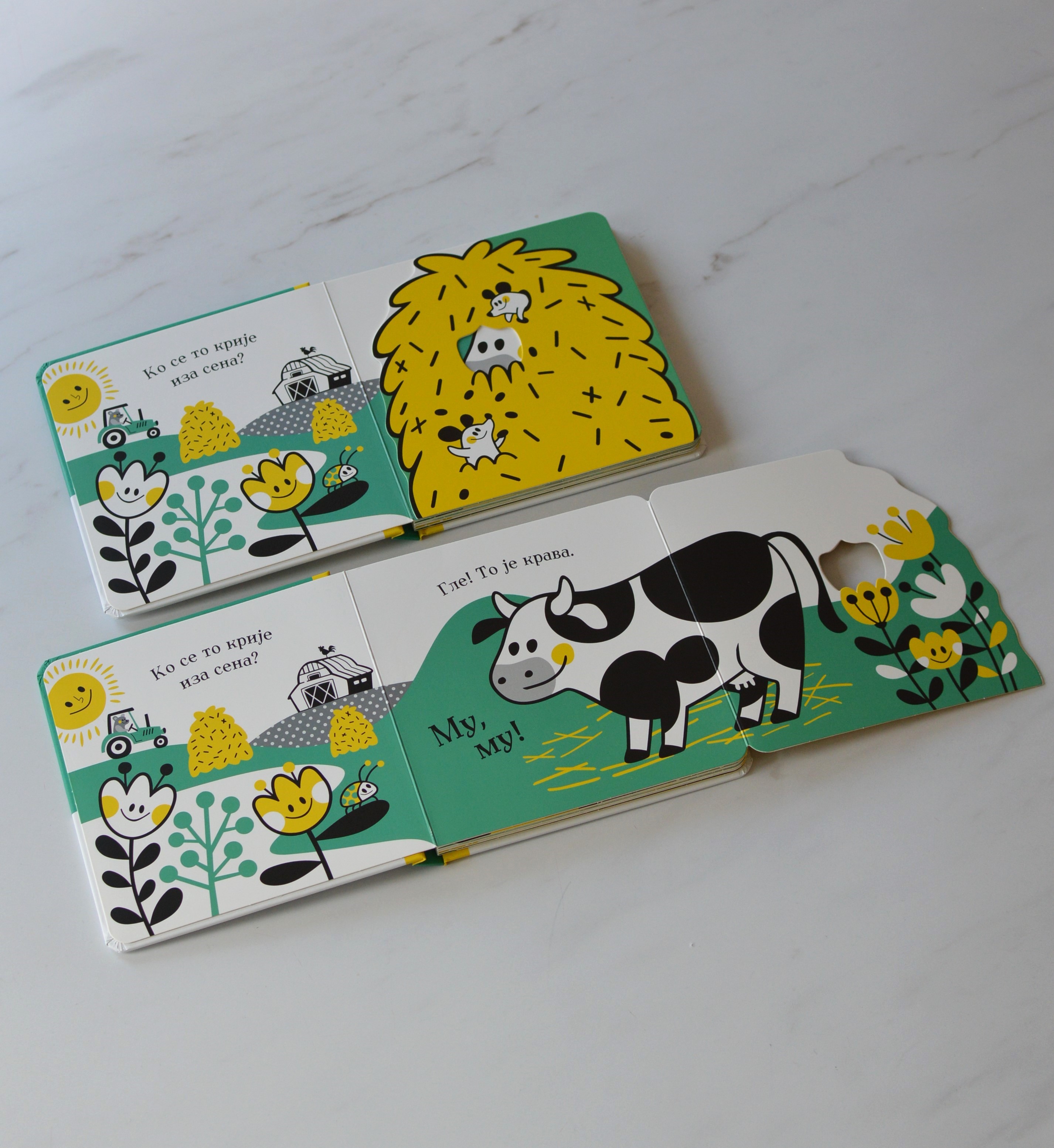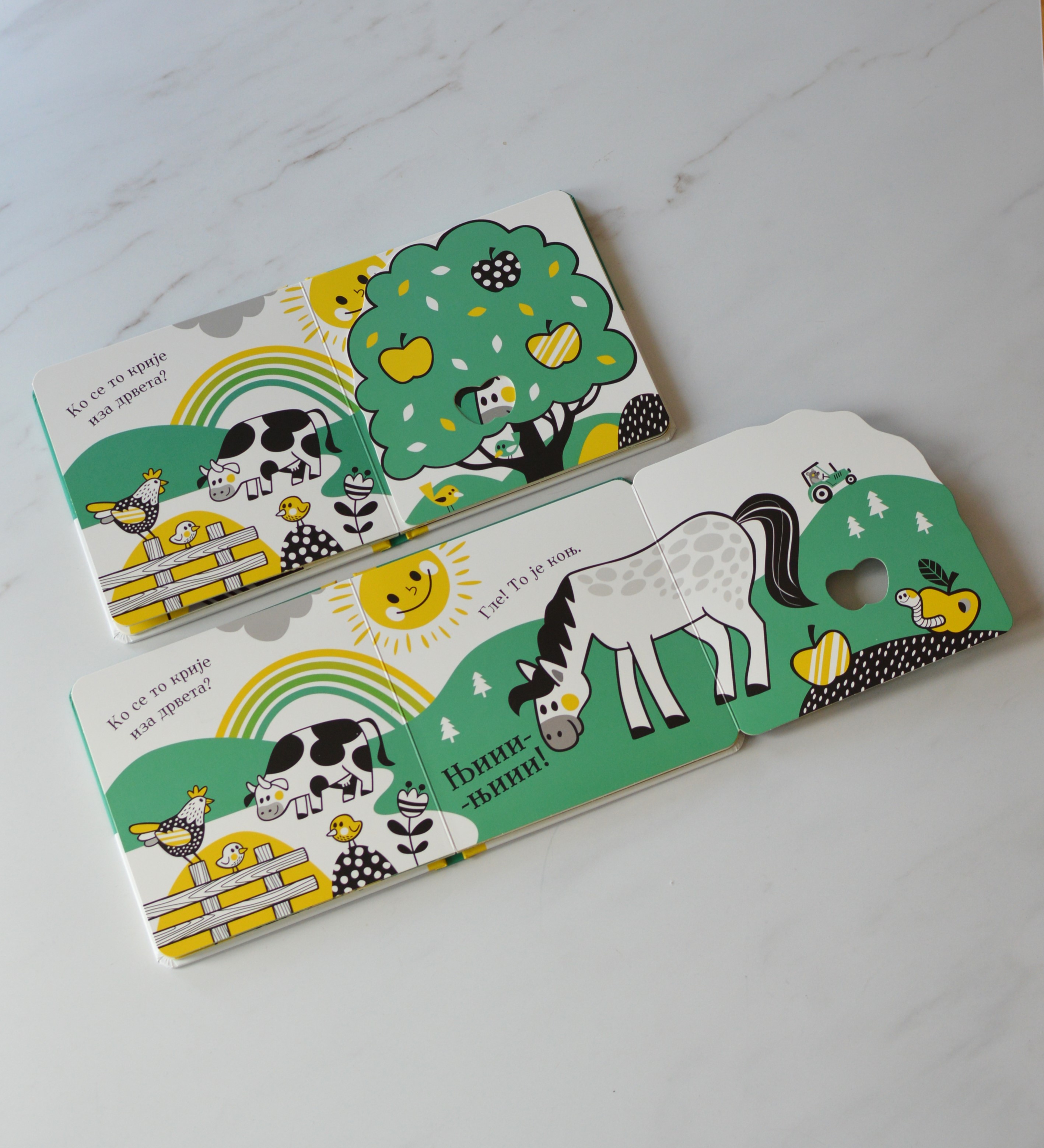 Vaša beba će uživati u igri skrivanja s dragim domaćim životinjama koje se kriju ispod preklopa.