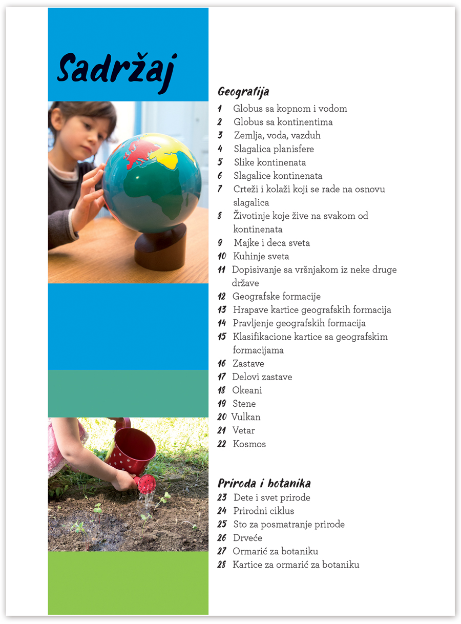 Discipline kao što su geografija, botanika, zoologija, vreme i kosmos zanimaju decu i povezuju ih sa svetom. U pristupu ovim različitim temama, u Montesori školama koriste se veoma različite pedagoške aktivnosti: čitanje i pisanje, manipulisanje predmetima, razvrstavanje po parovima, klasifikacija, posmatranje.