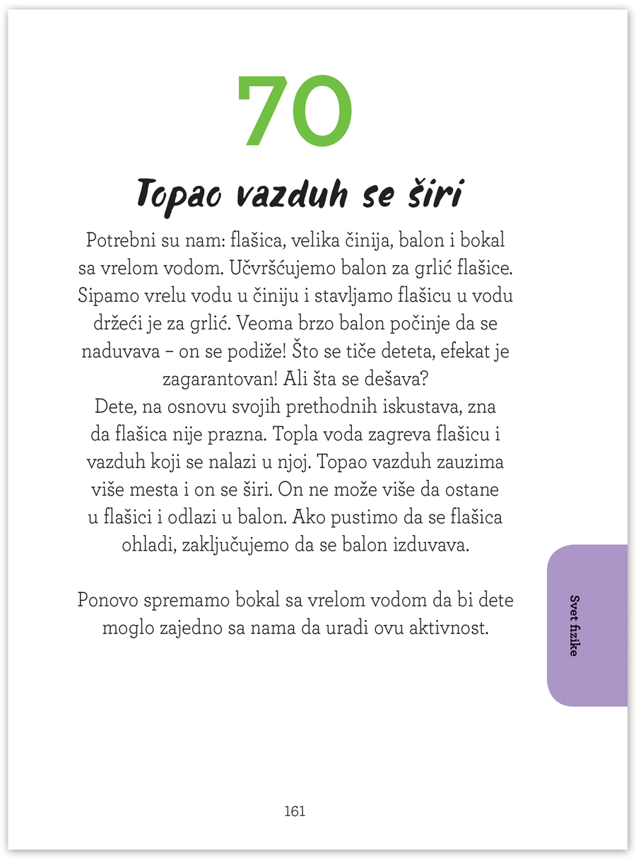 U ovoj knjizi predloženo je 100 aktivnosti koje pozivaju dete da posmatra, koristi svoje ruke i eksperimentiše kako bi samo otkrilo svet:
