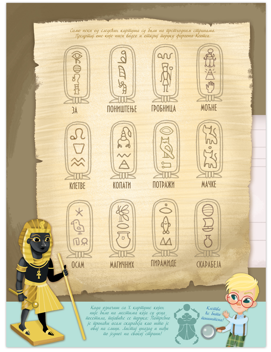 U Egiptu se dogodila velika krađa: ukradeno je blago iz faraonove grobnice. Agata i Artur pokušavaju da reše misteriju, ali im je potrebna pomoć da pronađu krivca. Na dnu svake stranice nalaze se uputstva koje deca treba da prate u ovoj nezaboravnoj avanturi. Ukoliko im zatreba pomoć na poslednjim stranicama se nalaze rešenja svih zadataka.
